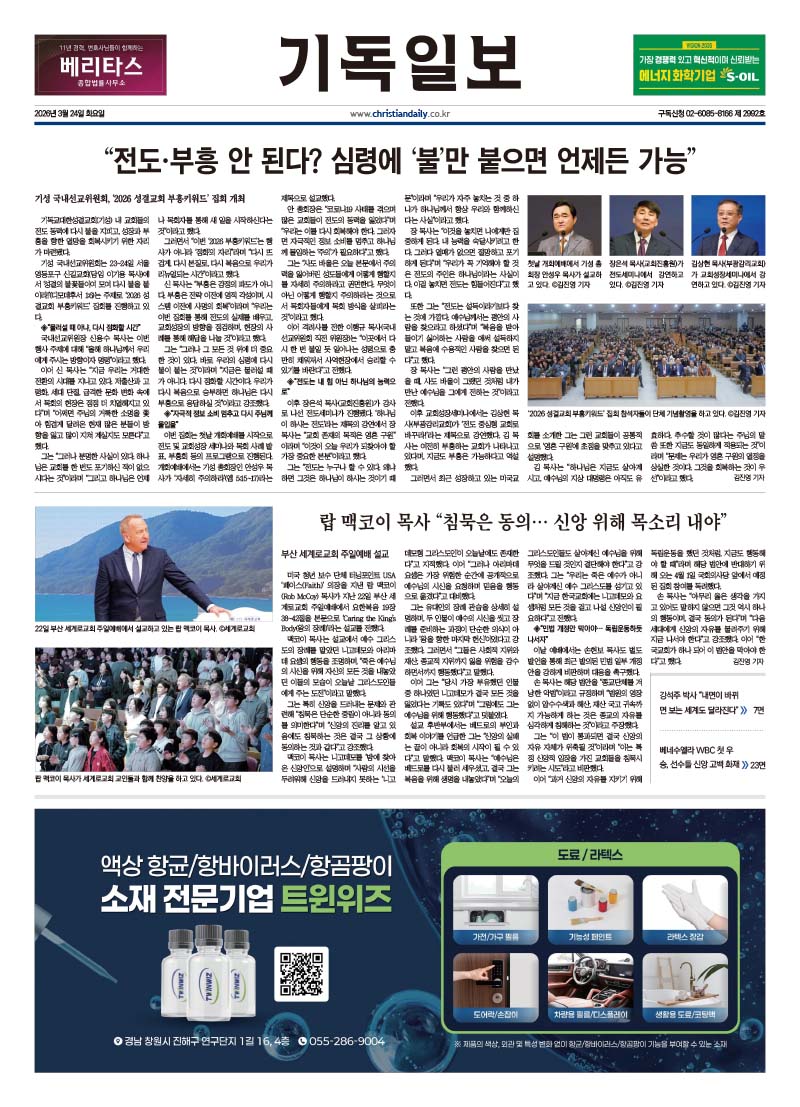 창립식 및 제1차 기도회 열고 단체 정체·방향성 공식화 “인본주의 맞서 복음으로”… ‘어웨이크’, 교회 각성·행동 촉구 교회일반 한국교회 깨어남 운동을 표방하는 A.W.A.K.E(어웨이크, 대표 권경희)가 서울 강남구 소재 한국통일진흥원에서 창립식 및 제1차 기도회를 열고 단체의 정체성과 방향을 공식화했다. 이 단체는 ‘Awaken(.. 노형구 기자 대광기총 “종교 자유 말살하는 민법 개정안 즉각 폐기하라”종교탄압으로 변질된 정교분리“한국교회, 자유와 신앙 지키며 국가 위한 기도와 책임을”