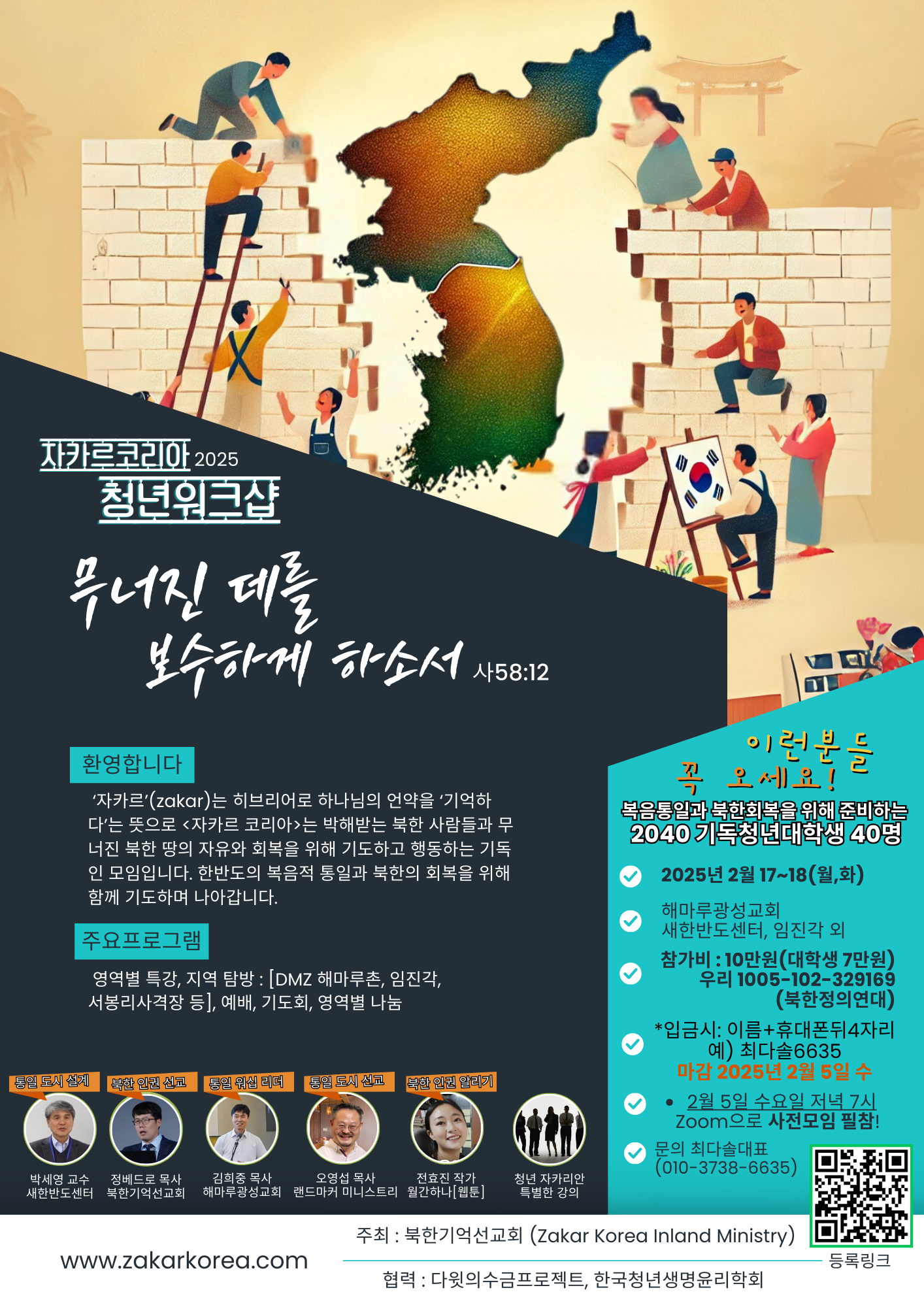 북한의 회복과 복음통일을 염원하는 기독 청년들을 위한 2025 자카르코리아 청년워크숍이 ‘무너진 데를 보수하게 하소서’(이사야 58:12)라는 주제로 DMZ내 해마루광성교회(김희중 목사)에서 다음달 17일부터 이틀간 열린다.