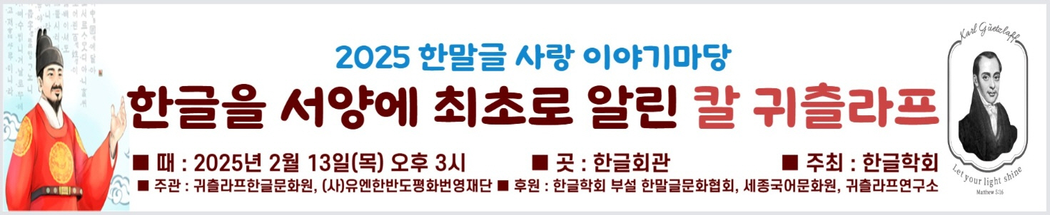 한글학회(회장 김주원)가 귀츨라프한글문화원(설립자 故 주대준, 대표 노광국)·(사)유엔한반도평화번영재단(UNPEACEKOR, 명예이사장 반기문, 이사장 김덕룡)과 공동으로 오는 13일(목) 오후 3시 서울 종로구 소재 한글회관(한글학회 강당)에서 ‘한말글사랑 이야기마당: 1832-2025 칼 귀츨라프와 한글 최초 세계화 포럼’을 개최한다.