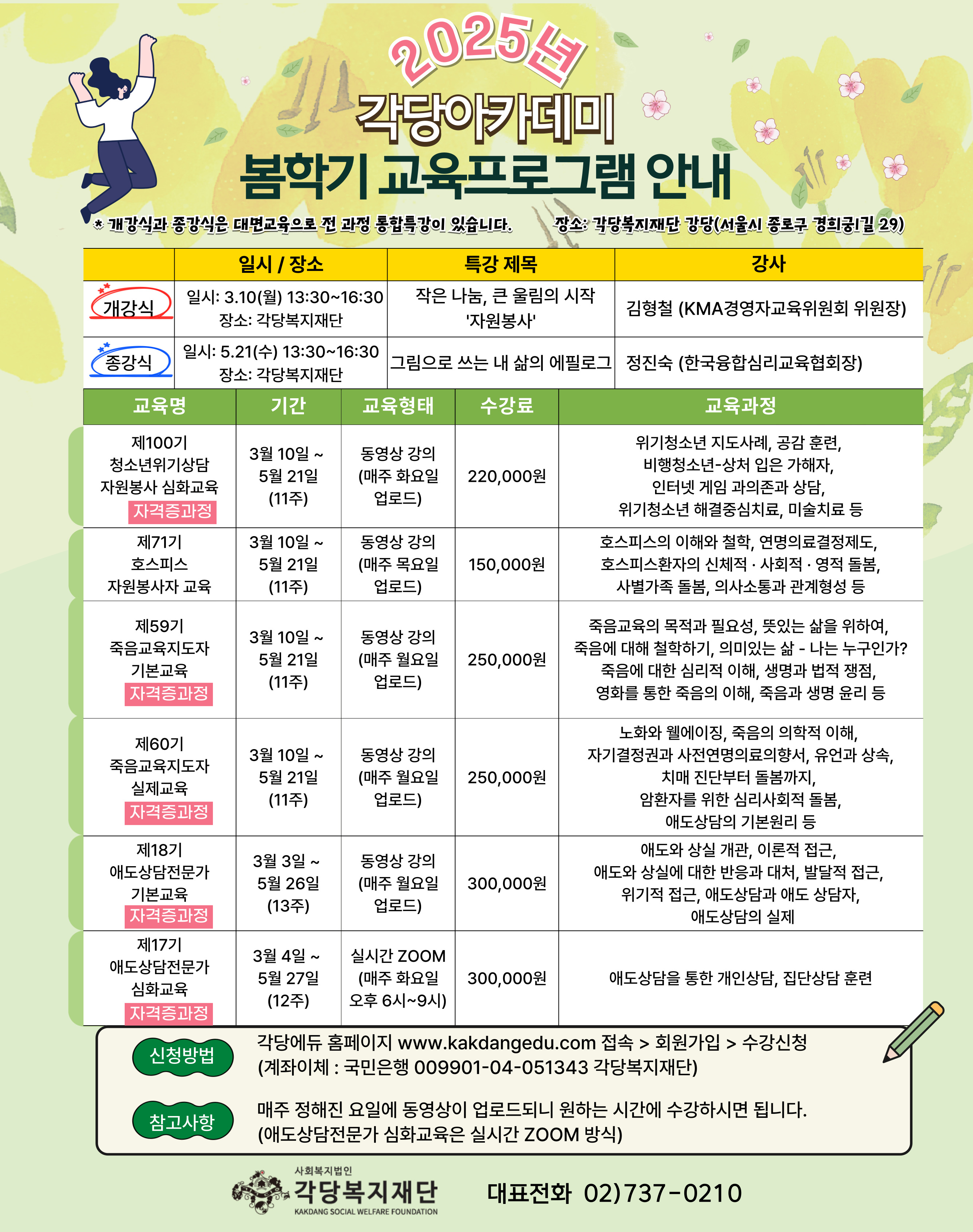 교육 신청은 각당 아카데미 홈페이지(www.kakdangedu.com)에서 가능하며, 자세한 사항은 02-737-0210으로 문의하면 된다.