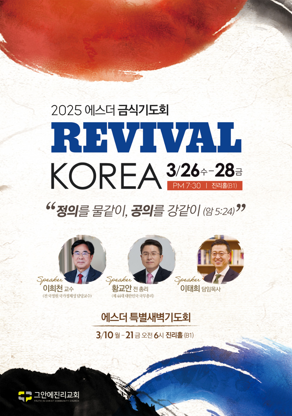 그안에진리교회(담임 이태희 목사)가 오는 3월 26일부터 28일까지 3일간 ‘나라와 민족을 위한 에스더 금식기도회’를 개최한다.