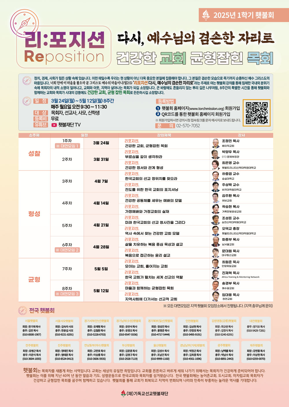 기독교선교횃불재단(이하 횃불재단)이 ‘리포지션(Reposition)’이라는 주제로 오는 24일부터 5월 12일까지 매주 월요일, 총 8차례에 걸쳐 2025년도 1학기 횃불회 온라인 강의를 진행한다.