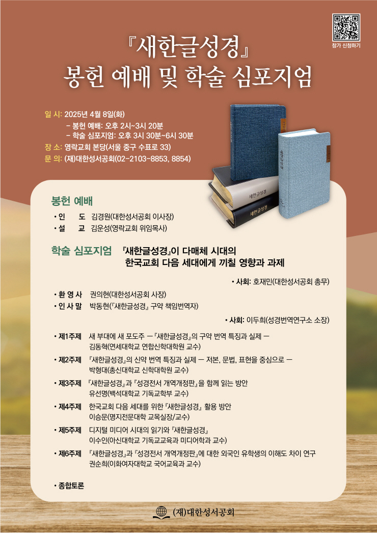 '새한글성경' 봉헌 예배는 당일 오후 2시에 시작되며, 김경원 이사장(대한성서공회)의 인도와 김운성 목사(영락교회)의 설교로 진행된다. 이어서 열리는 학술 심포지엄은 ‘새한글성경이 다매체 시대의 한국교회 다음 세대에게 끼칠 영향과 과제’라는 주제로, 오후 3시 30분부터 오후 6시 30분까지 진행될 예정이다.