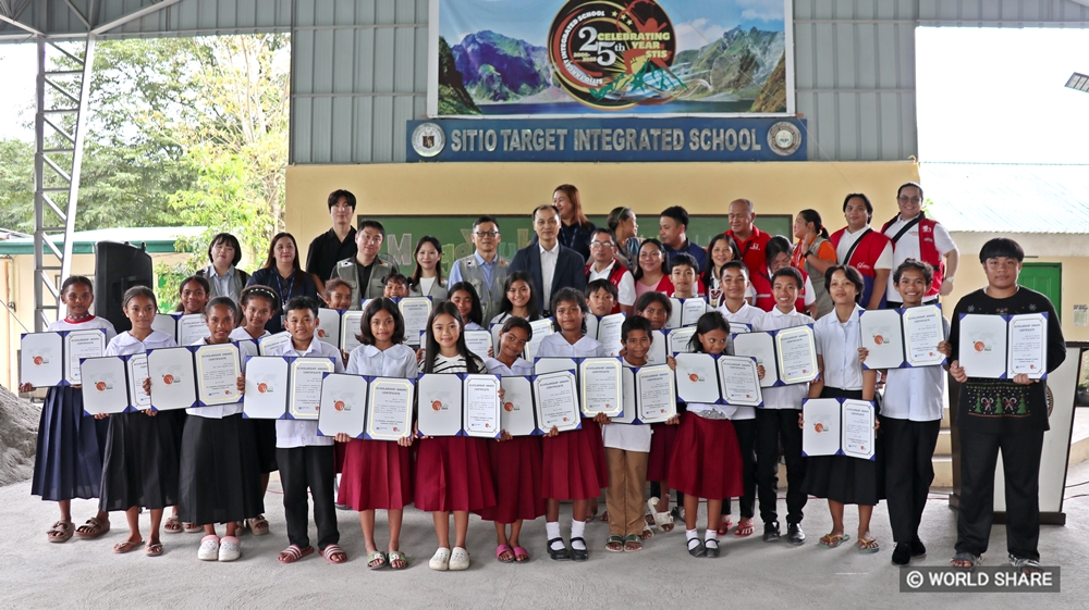 필리핀 시티오타겟 통합학교 학생들이 장학 증서를 받고 환하게 웃고 있다. ©월드쉐어 제공