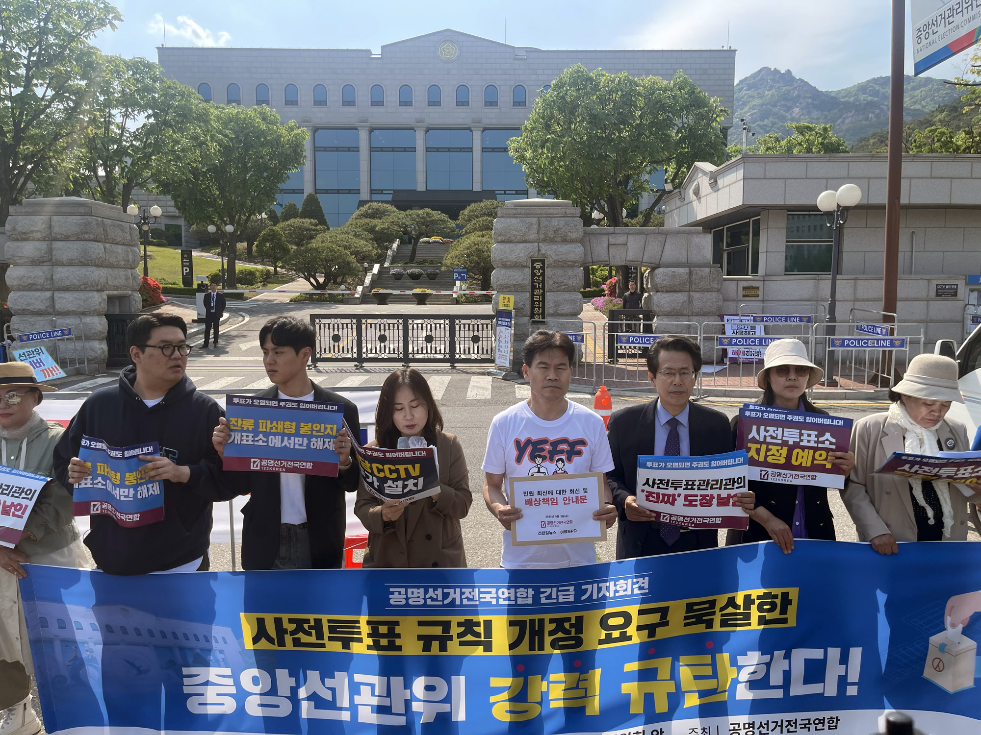 공선연은 “지난 4월 18일 중앙선관위 앞 기자회견을 개최한 후 건물 내 접견실에서 선거상황실 공무원 3인에게 사전투표 시행규칙 개정을 촉구하는 민원 공문을 제출하면서 노태악 위원장과 김용빈 사무총장과의 면담을 요청했다”며 “그러나 의견 민원임을 사유로 노 위원장과 김 사무총장과의 면담을 불허하며 4월 29일 회신한 외화내빈(外華內貧) 공문을 통해 우리의 요구를 전면 거부하는 입장을 피력했다”고 했다.
