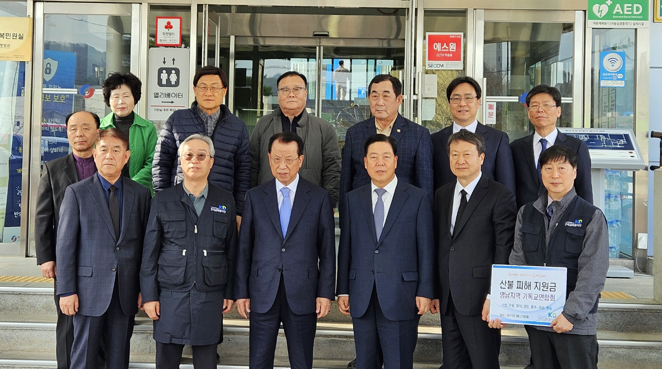 한교봉 관계자들이 산불 피해 지원금을 전달하던 모습 ©한교봉