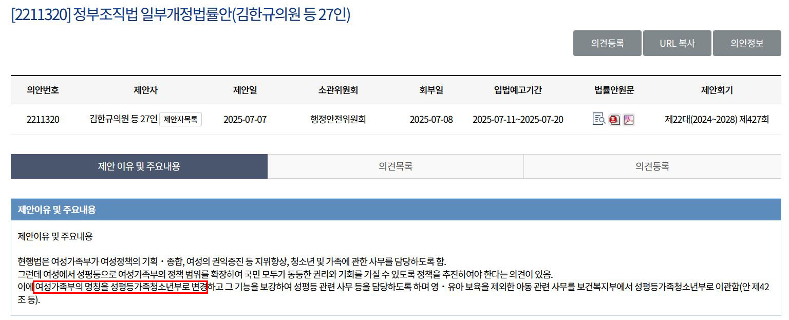 이들은 “이에 여성가족부의 명칭을 성평등가족청소년부로 변경하고 그 기능을 보강해 성평등 관련 사무 등을 담당하도록 하며 영·유아 보육을 제외한 아동 관련 사무를 보건복지부에서 성평등가족청소년부로 이관한다(안 제42조 등)”고 해당 법안 발의 이유와 주요 내용을 설명했다.
