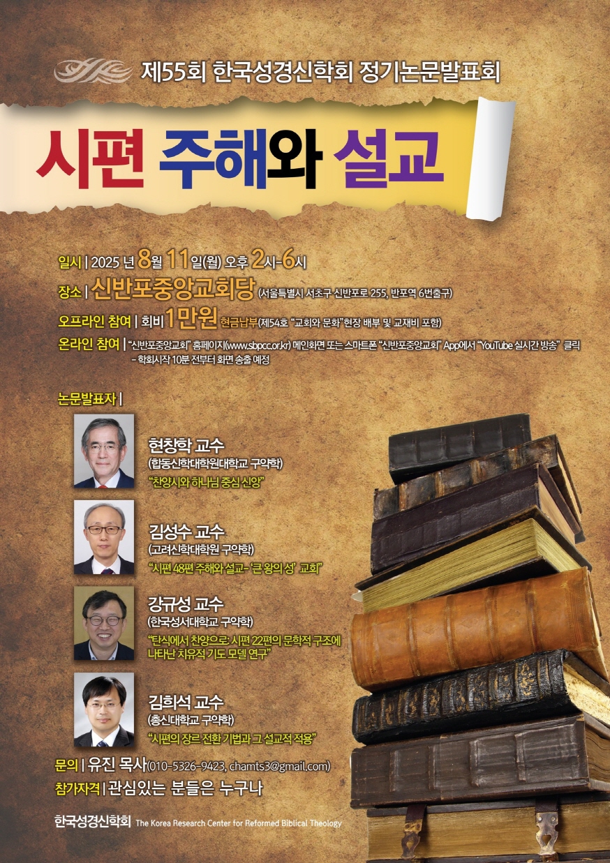논문 발표에는 ▲현창학 교수(합동신대)가 ‘찬양시와 하나님 중심 신앙’ ▲김성수 교수(고려신학대)가 ‘시편 48편 주해와 설교-큰 왕의성 교회’ ▲강규성 교수(한국성서대)가 ‘탄식에서 찬양으로: 시편 22편의 문학적 구조에 나타난 치유적 기도 모델 연구’ ▲김희석 교수(총신대)가 ‘시편의 장르 전환 기법과 그 설교적 적용’이라는 주제로 각각 발제한다.