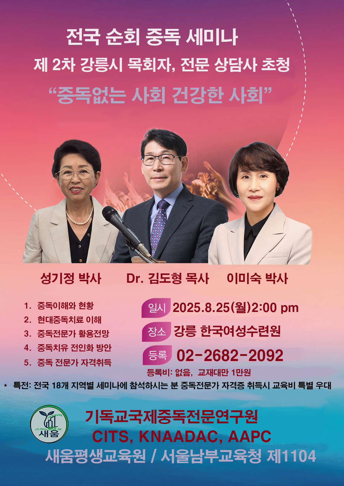 성경적 가르침으로 중독 없는 건강한 세상을 만들어 가는 기독교국제중독전문연구원(원장 김도형 목사)이 8월 25일 오후 2시, 강원도 강릉 한국여성수련원에서 ‘제2차 전국 순회 중독세미나’를 이어간다.