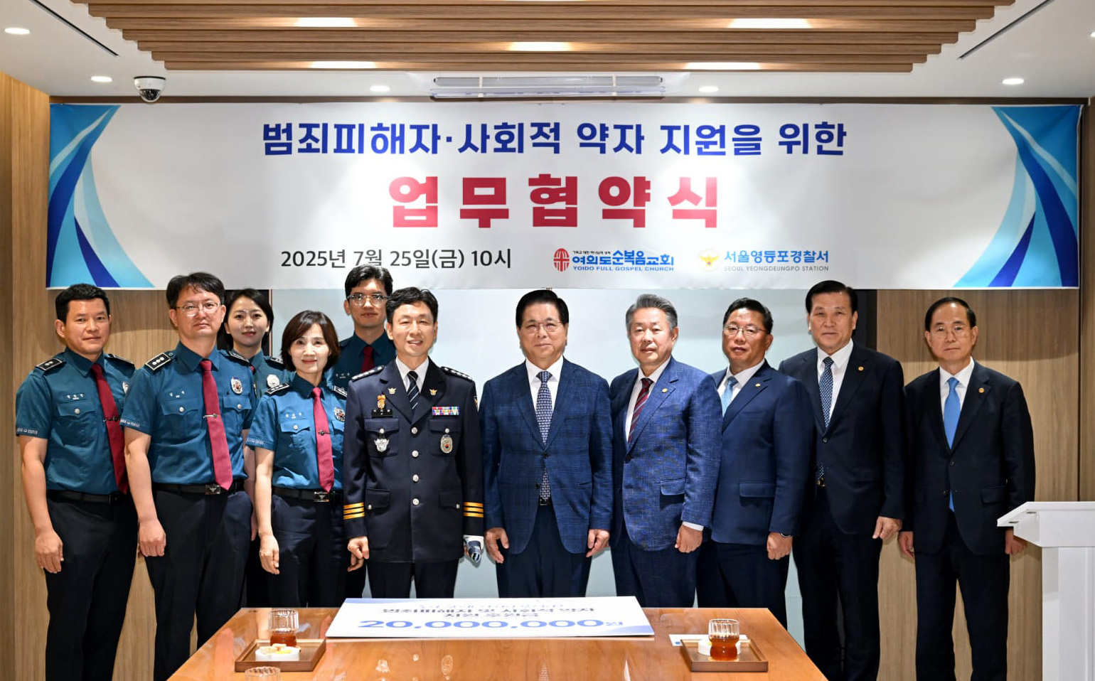 지지환 서장은 “신뢰받는 지역 공동체 파트너인 여의도순복음교회와 함께할 수 있어 감사하다”며 “범죄 피해자와 사회적 약자 보호를 위한 지속적인 협력 체계를 이어가겠다”고 밝혔다.