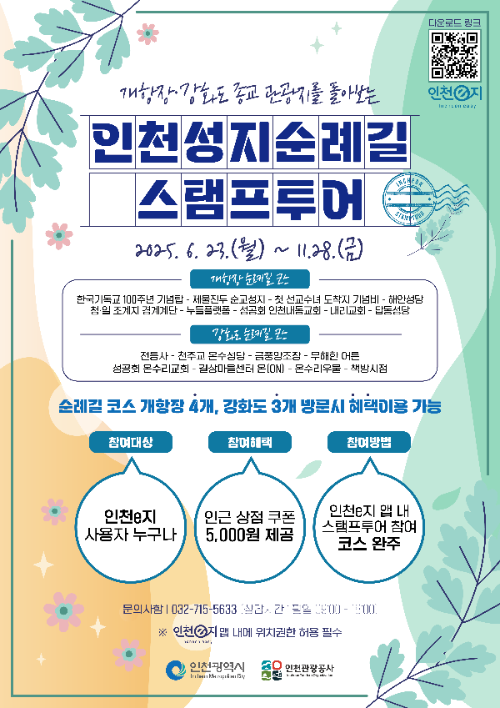 참여는 ‘인천e지’ 앱 설치 후 ‘2025 인천 성지순례길 스탬프투어(개항장)’를 선택하면 된다. GPS 기반으로 스탬프가 자동 부여된다.