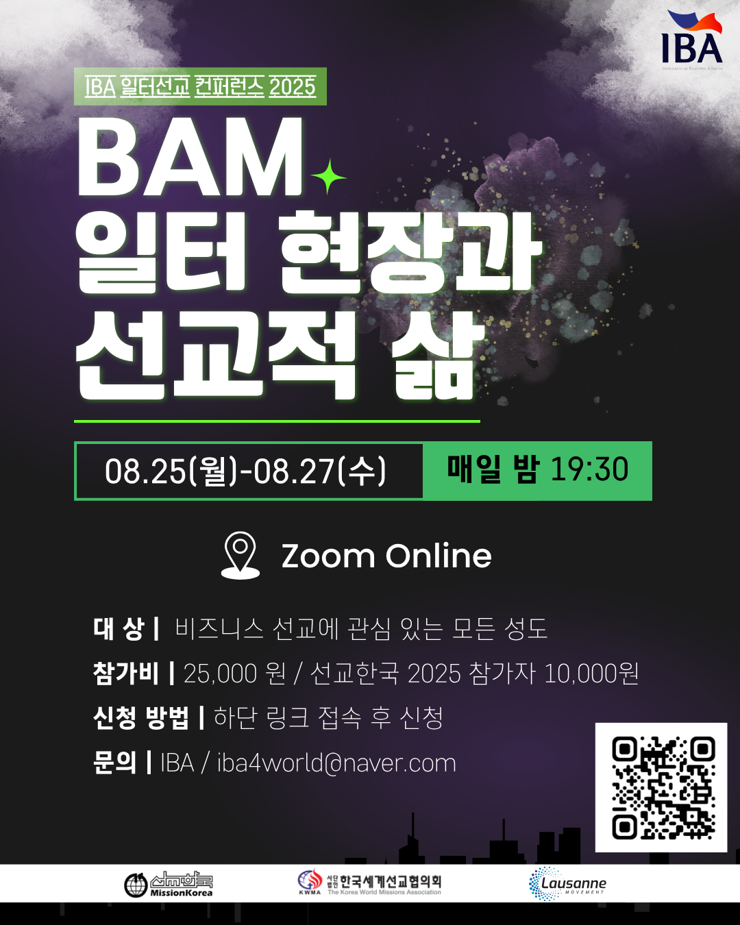 국제 BAM 얼라이언스(IBA)가 주최하고 선교한국과 KWMA가 공동 주관하는 ‘IBA 일터선교 컨퍼런스 2025’가 오는 8월 25일부터 27일까지 3일간 온라인(ZOOM)으로 개최된다. ‘BAM: 일터 현장과 선교적 삶’을 주제로 열리는 이번 컨퍼런스는 비즈니스 선교(Business As Mission, 이하 BAM)에 관심 있는 모든 성도를 대상으로 하며, 선착순 90명을 모집 중이다.