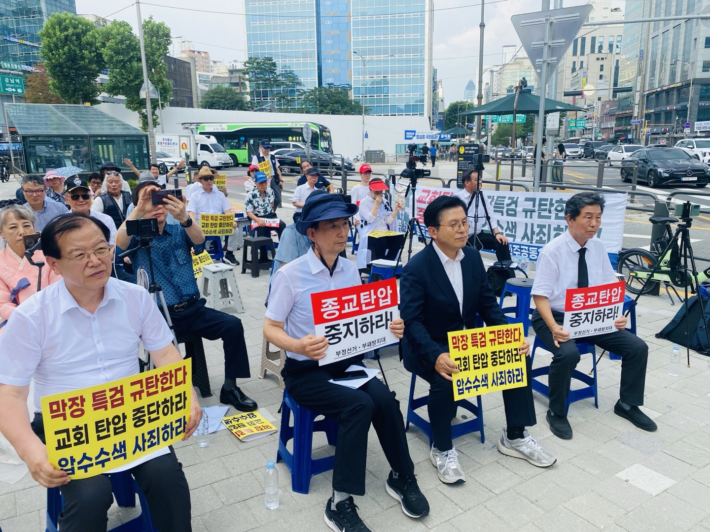 한국교회목회자연합이 주최하고 한국교회반동성애교단연합 등이 주관한 ‘교회 압수수색 규탄 집회’가 8일 오후 서울 지하철 교대역 11번 출구 앞에서 진행됐다. 이곳은 검찰청과 법원 등이 가까이 있는 곳이다.