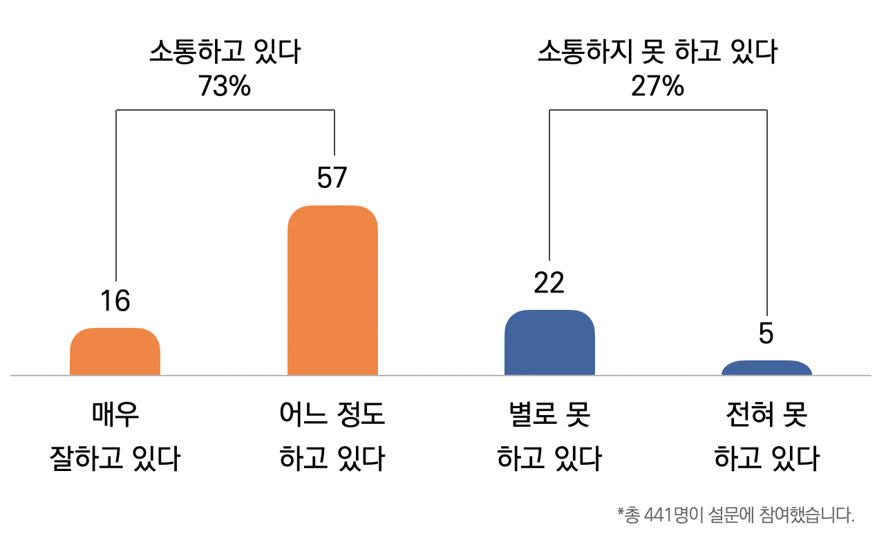 이에 따르면, ‘매우 잘하고 있다’ 16%, ‘어느 정도 하고 있다’ 57%로 ‘소통하고 있다’는 응답이 73%로 나타났다. 반면, ‘소통하지 못 하고 있다’(전혀 5%+별로 22%)는 27%로 목회자 10명 중 3명 정도는 청년세대와의 소통이 원활하지 않은 것으로 파악됐다.