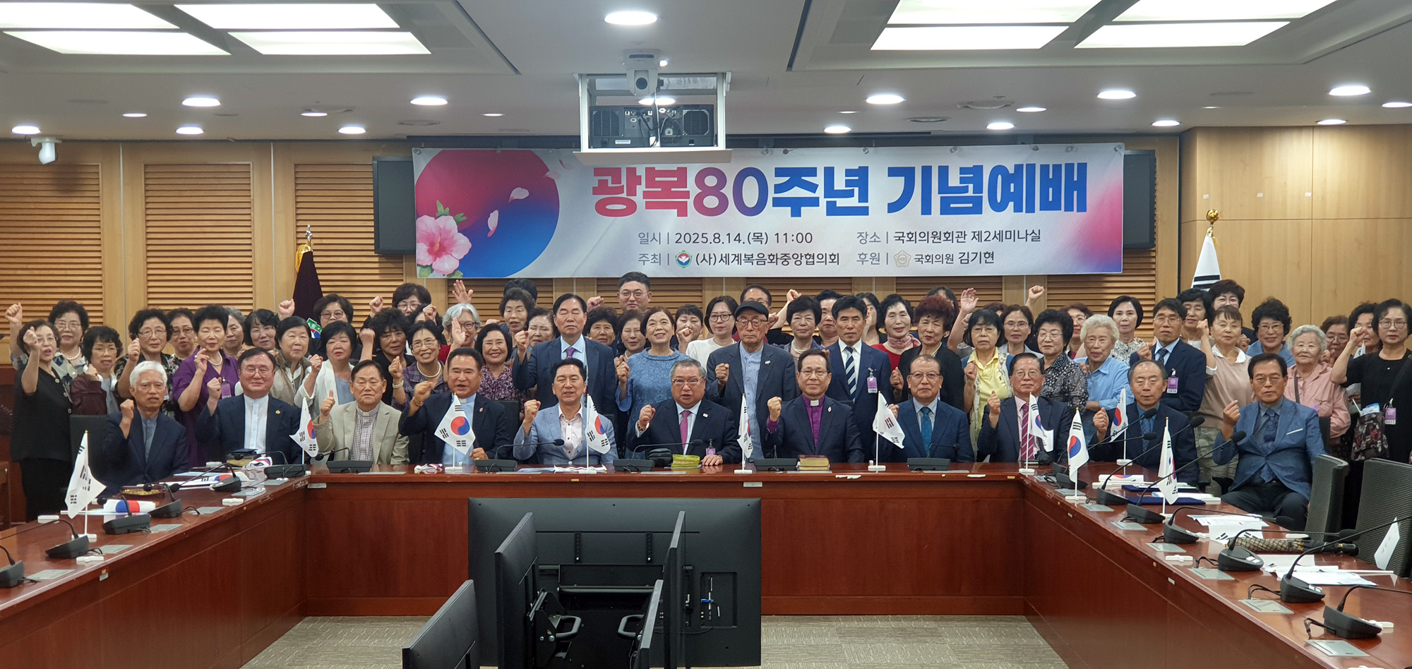 사단법인 세계복음화중앙협의회(총재 엄기호 목사, 대표회장 김영신 목사, 이하 세복협)가 14일 국회의원회관 제2세미나실에서 광복 80주년 기념예배를 드렸다.