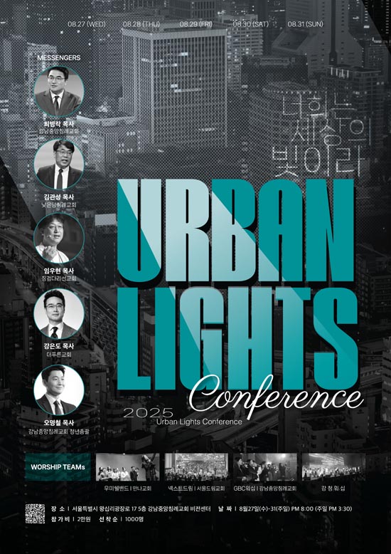 오는 8월 27일부터 31일까지 서울 강남중앙침례교회에서 ‘URBAN LIGHTS CONFERENCE 2025’(어반 라이츠 컨퍼런스)가 개최된다. 이번 집회는 변화가 빠른 시대 속에서 신앙의 길을 잃기 쉬운 청년들이 말씀과 예배, 기도와 찬양을 통해 그리스도의 빛을 다시 회복하도록 돕는 것을 목적으로 준비됐다.
