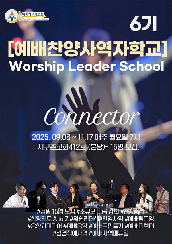 예배사역자연합(예사연)이 주최하는 예배찬양사역자학교(예찬사) 6기가 오는 9월 8일부터 11월 17일까지 매주 월요일 오후 7시, 분당 지구촌교회(담임 김우준 목사) 분당성전 412호에서 진행된다. 이번 과정은 ‘Connector(연결자)’를 주제로 예배 인도자 리더십 5단계와 실제 음악 사역 역량을 다루는 심화 훈련으로 준비됐다.