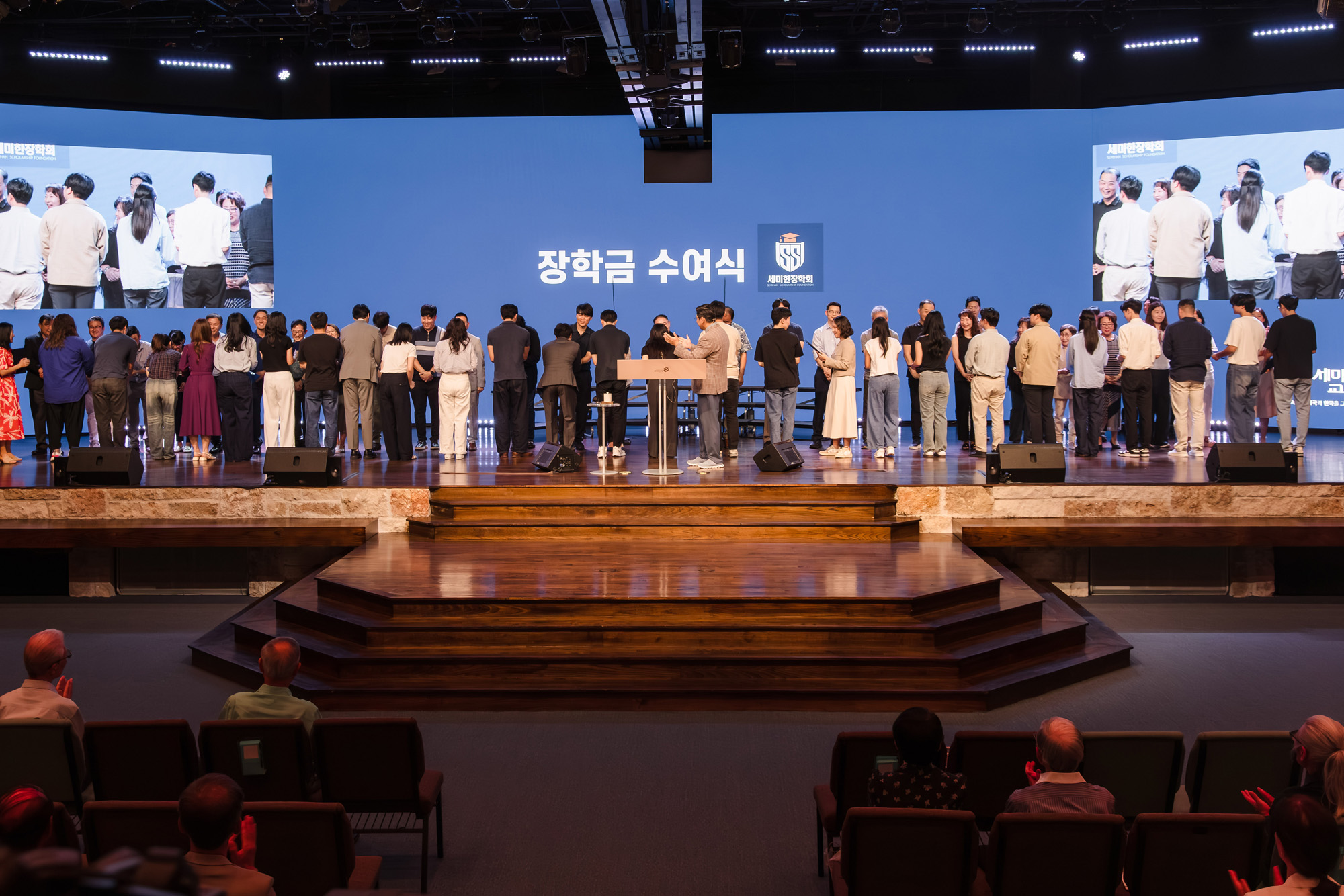덕분에 올해는 총 52명의 지원자(신학생 포함) 전원이 선발되어, 모두가 장학금을 받는 기쁨을 함께 누리게 되었다. 이날 예배에서는 27명의 장학생과 장학위원들이 단상에 함께 올랐으며, 장학생 대표의 인사말에 이어 장학금 수여식이 진행되었다. 장학금 전달은 장학위원이 후원하는 학생에게 직접 전달하는 방식으로 이뤄져 더욱 의미 있는 시간이 되었다.