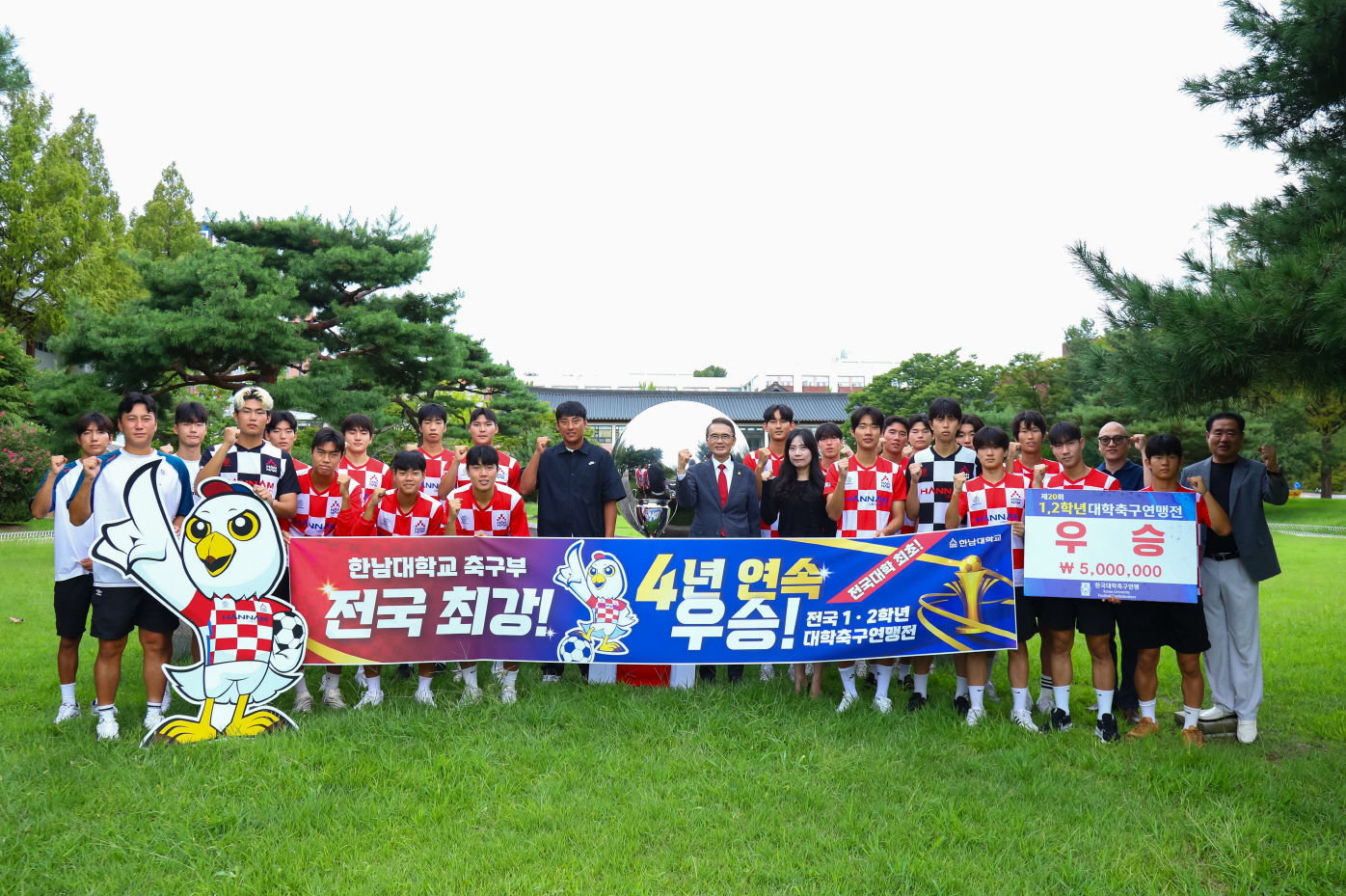 한남대학교 축구부가 대학축구연맹전에서 4년 연속 정상에 오르는 전례 없는 기록을 세우고, 이를 기념하는 축하 행사를 개최했다.