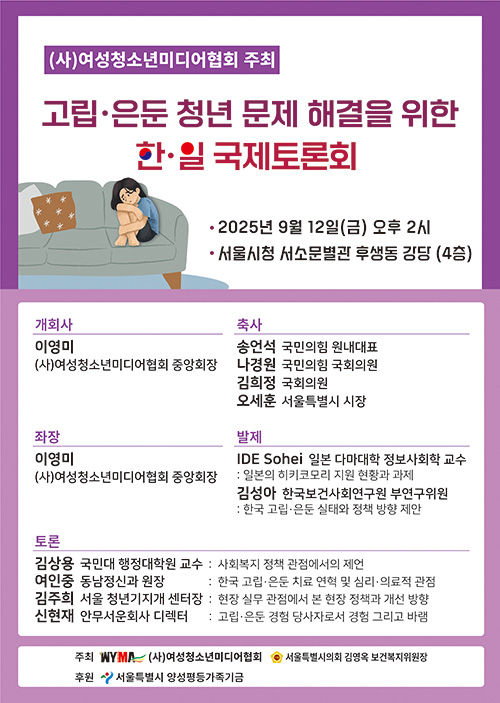 오는 9월 12일 오후 2시 서울시청 서소문별관 후생동 4층 강당에서 열리는 ‘고립·은둔 청년 문제 해결을 위한 한·일 국제토론회’에는 양국에서 고립·은둔 청년들을 위해 최전선에서 일하는 전문가들을 초청해 발제와 토론으로 진행한다. 행사는 여성청소년미디어협회, 서울특별시의회 김영옥 보건복지위원장이 공동주최하고, 서울특별시 양성평등가족기금이 후원한다.