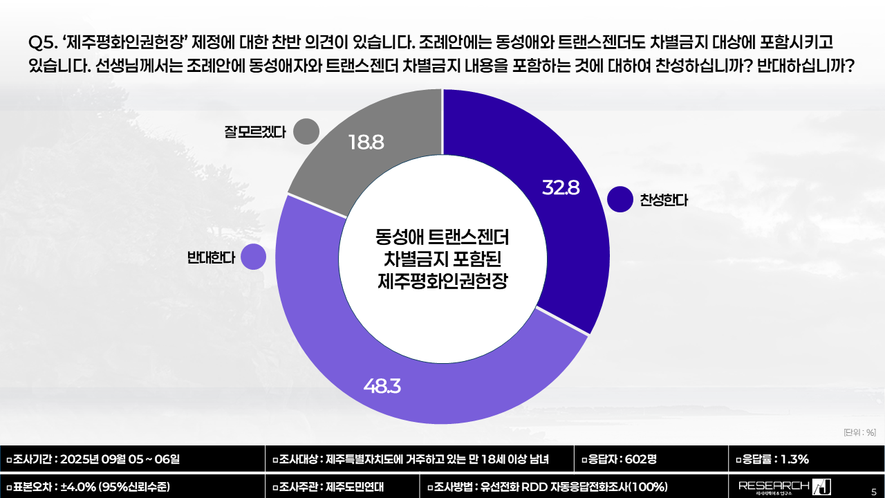 이에 따르면 제주평화인권헌장이 동성애와 트랜스젠더 차별금지 내용을 포함하는 것에 찬성한 비율은 32.8였다. 18.8%는 잘 모르겠다고 답했다.