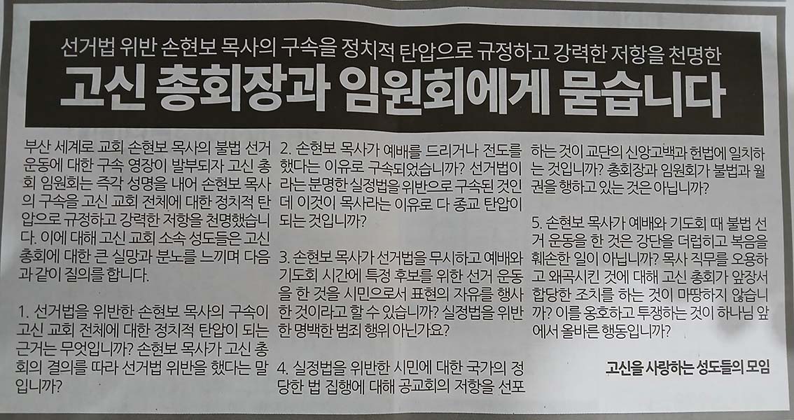 고애연은 “더 나아가, 최근에는 손현보 목사의 구속을 ‘선거법 위반에 따른 정당한 법 집행’이라 강변하며, 고신총회가 발표한 정당한 성명을 비난하는 광고까지 게재했다”며 “그러나 고신총회의 성명은 대법원 판례에 기초하여 손현보 목사에게 도주나 증거인멸의 우려가 없음에도 구속이 발부된 것은 정치적 탄압임을 천명한 것이다. 이를 두고 총회를 공격한 광고는, 총회의 정당한 권위를 흔들고 고신 교단 전체를 모독한 반총회적·반역사적 행위”라고 했다.
