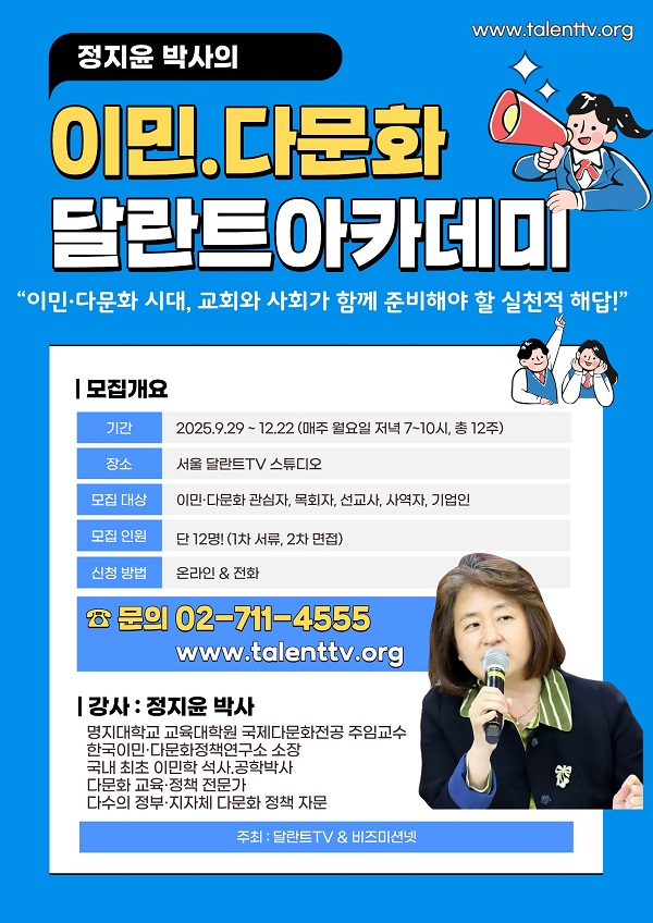 대한민국의 이민·다문화 교육에 새로운 흐름이 형성되고 있다. 달란트TV는 명지대학교 교육대학원 국제다문화전공 정지윤 박사와 협력해 ‘이민·다문화 달란트 아카데미’를 개설하고 오는 29일부터 본격적인 교육 과정을 시작한다.