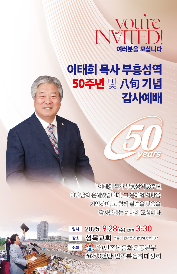 민족복음화운동본부는 “교계 지도자들과 전국 각지의 성도들이 이번 감사예배에 모여 지난 50년간의 이태희 목사 사역을 되돌아보고, 하나님의 은혜에 감사할 예정”이라며 “또한 앞으로 다가올 ‘2027 8천만 민족복음화대성회’의 비전을 공유하며, 한국교회의 연합과 세계 복음화 운동에 새 힘을 불어넣는 계기가 될 것으로 기대된다”고 전했다.