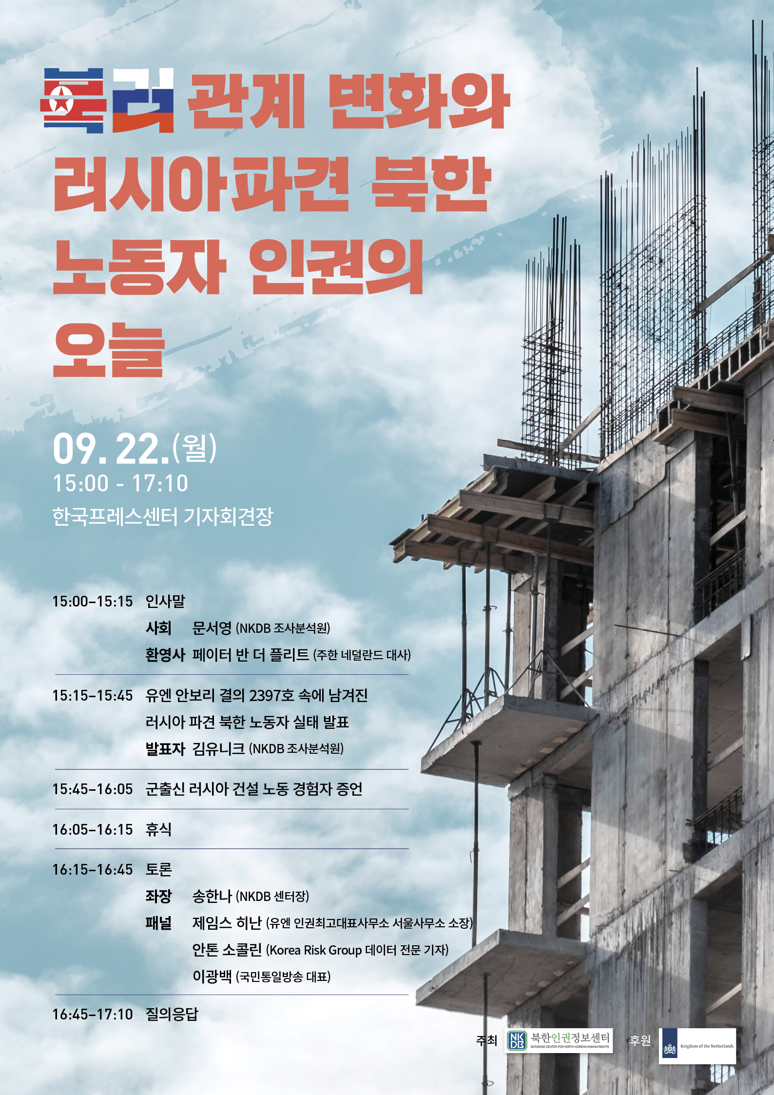 NKDB는 오는 22일 오후 3시, 한국프레스센터 19층 기자회견장에서 「북러관계 변화와 러시아 파견 북한 노동자 인권의 오늘」 세미나를 개최한다. 이번 세미나는 주한 네덜란드 대사관의 지원으로 진행되며, 새롭게 발간되는 연구 보고서의 주요 결과를 최초로 발표한다.