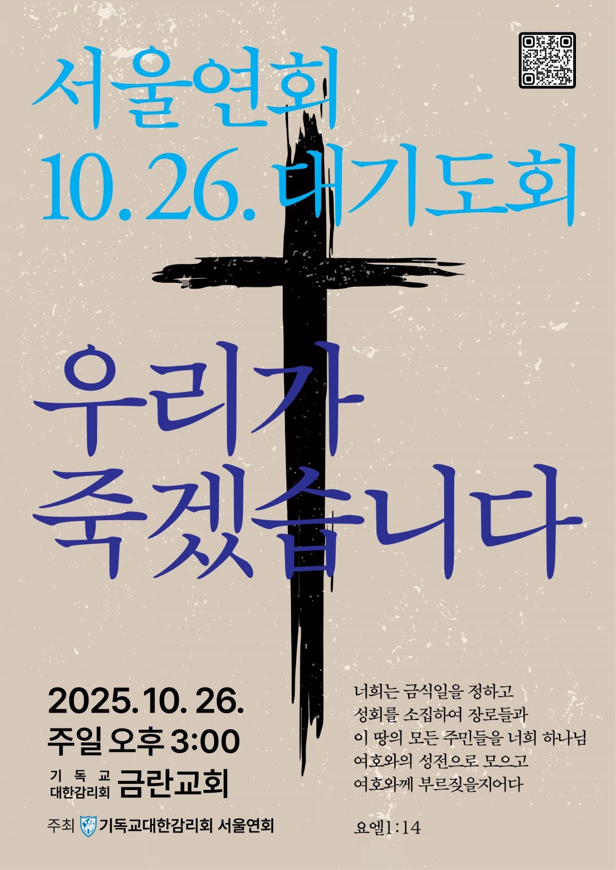 기독교대한감리회 서울연회(감독 김성복)가 선교 140주년을 기념해 오는 10월 26일 오후 3시 서울 금란교회에서 ‘우리가 죽겠습니다’를 주제로 한 대규모 기도집회를 연다. 약 1만 명이 참석할 것으로 예상되는 이번 모임은 한국교회의 회개와 갱신, 그리고 새로운 부흥을 기도하기 위해 마련됐다.