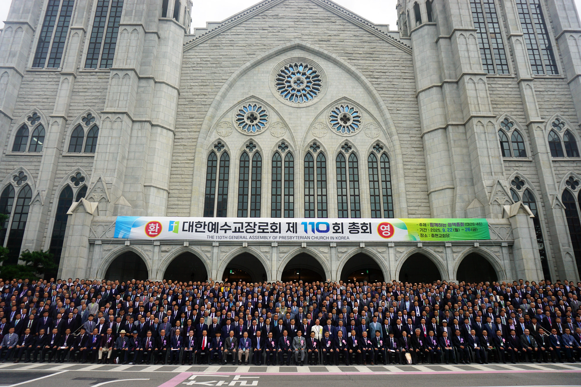 예장 합동 제110회 정기총회에 참석한 총회대의원(총대)들이 셋째날(24일) 오전회무를 마치고 총회가 열리고 있는 서울 충현교회 앞에서 단체 기념촬영을 하고 있다. ©김진영 기자