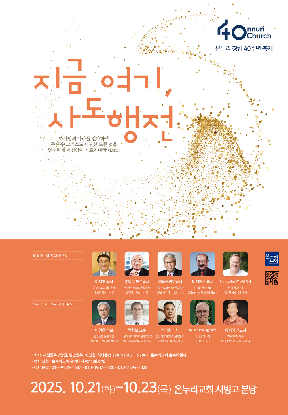 이재훈 목사는 “OMC는 지난 40년의 은혜를 돌아보고, 기념 책 <지금 여기, 사도행전>에 담긴 정신을 이어받아 앞으로 나아갈 길을 모색하는 가장 중요한 자리가 될 것”이라며 “복음 위에 굳건히 서서 문화를 통해 세상과 소통하고 선교로 열매 맺는 교회의 본질을 한국교회와 함께 고민하고 기도하는 시간이 되기를 바란다”고 밝혔다.