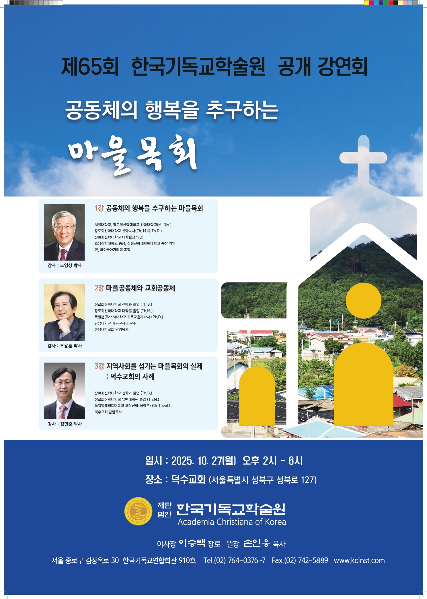 (재)한국기독교학술원(원장 손인웅, 이사장 이승택)이 오는 10월 27일 오후 서울 성북구 소재 덕수교회에서 ‘공동체의 행복을 추구하는 마을 목회’라는 주제로 제65회 학술공개세미나를 개최한다.