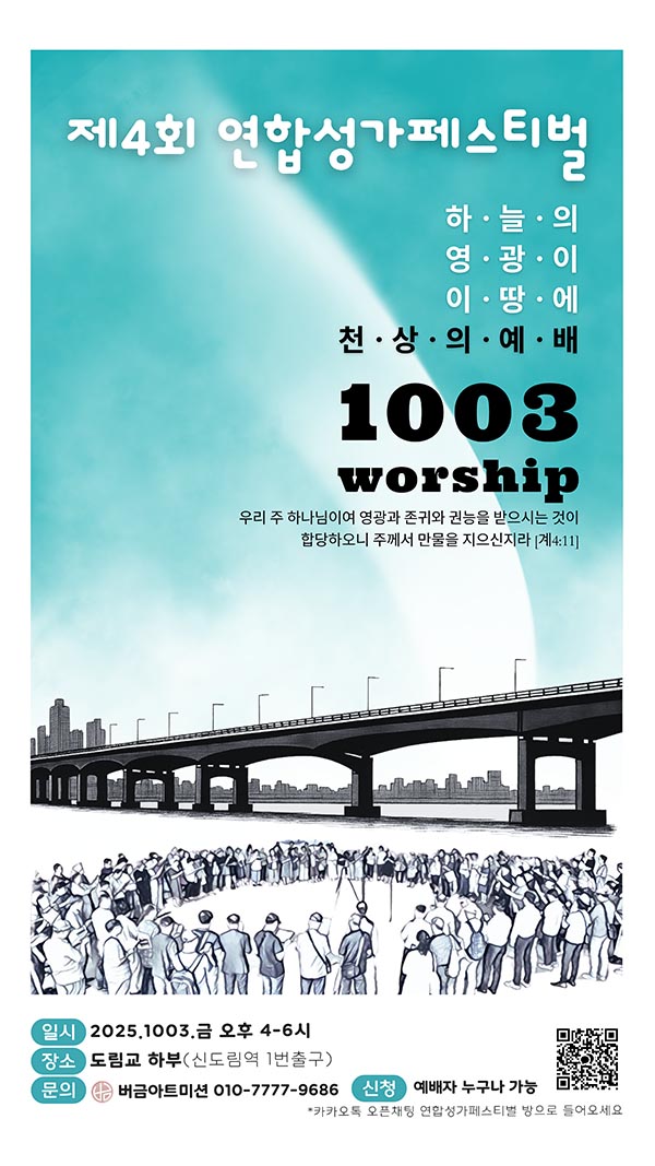 서울 도림교 하부(신도림역 1번 출구 인근)에서 오는 10월 3일 오후 4시부터 6시까지 ‘제4회 연합성가페스티벌’이 열린다. 이번 행사는 전국에서 모인 약 1천여 명의 예배자들이 함께 찬양을 나누는 자리로 마련됐다.