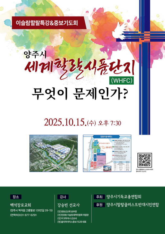 양주시기독교총연합회가 오는 15일 오후 7시 30분 양주시 백석읍 백석장로교회에서 ‘이슬람 할랄 특강 및 중보기도회’를 연다. 이번 행사는 양주시가 추진 중인 세계할랄식품 클러스터(WHFC) 조성 사업의 문제점을 점검하고 대안을 모색하기 위해 마련됐다.