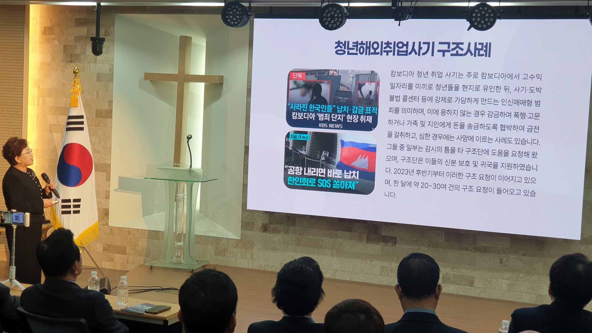 한인구조단 이정숙 회장은 구조단이 캄보디아에서 취업사기를 당한 한국 청년들을 구조한 사례를 소개하기도 했다. 이 회장은 “주로 캄보디아에서 고수익 일자리를 미끼로 청년들을 현지로 유인한 뒤, 사기·도박 불법 콜센터 등에 강제로 가담하게 만드는 인신매매형 범죄가 일어나고 있다”고 했다.