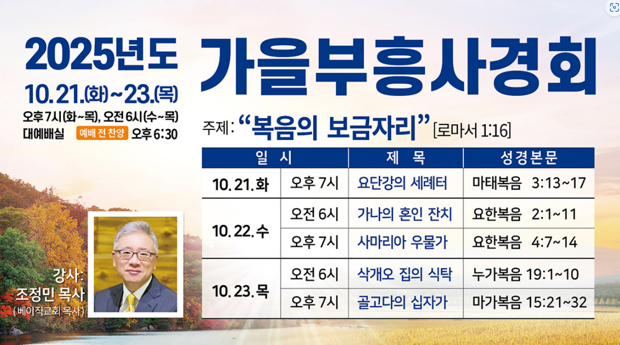 교회 관계자는 “이번 사경회가 복음의 본질을 되새기고 신앙의 보금자리를 회복하는 계기가 되길 바란다”며 “조정민 목사의 강의를 통해 하나님의 말씀 속에 담긴 생명력을 깊이 체험하길 기대한다”고 전했다.