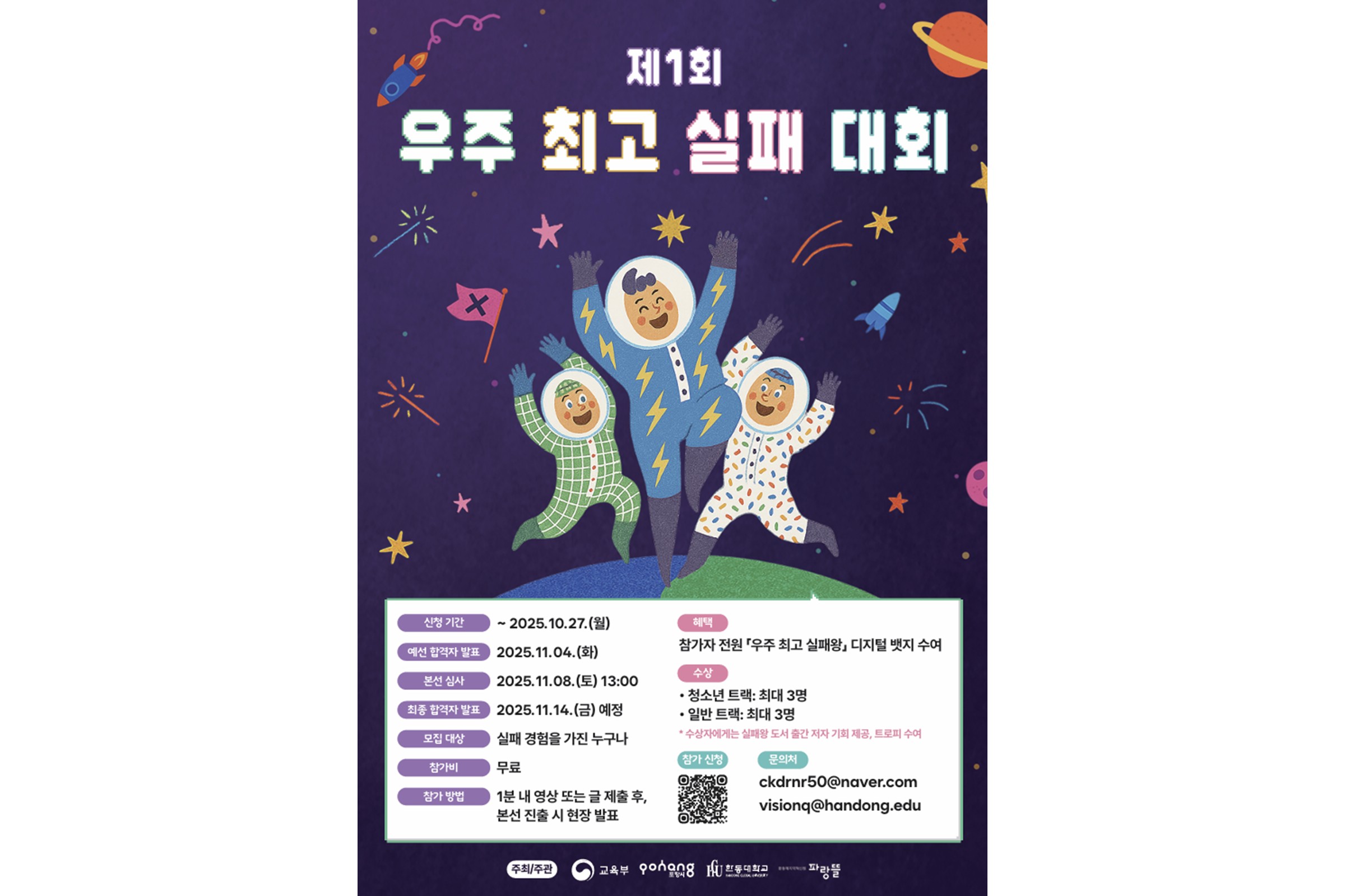 참가자 전원에게는 ‘우주 최고 실패왕’ 디지털 뱃지와 ‘실패 이야기 모음집’이 제공되며, 우수 참가자에게는 자신의 실패담을 책으로 엮을 기회와 함께 비슷한 경험을 공유한 사람들과의 네트워킹 프로그램이 마련된다.