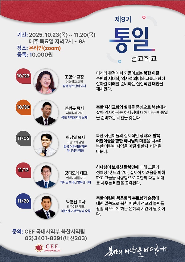 또한 한국 교회와 성도들에게 이번 통일선교학교를 위한 기도와 참여를 요청했다. 협회는 “이번 과정을 통해 북한 어린이 선교에 대한 비전을 나누고, 통일 시대를 대비한 복음적 준비를 함께하길 바란다”며 “관심 있는 성도들에게 널리 알려 더 많은 이들이 함께 동참하길 기대한다”고 전했다. 문의: 02-3401-8291