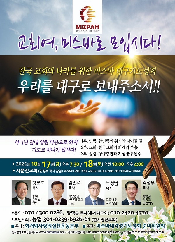 한국교회의 회개와 부흥, 그리고 민족의 위기 극복을 위한 대규모 연합 기도운동이 대구에서 열린다. 오는 10월 17일(금)부터 18일(토)까지 이틀간 대구 달성군 사문진교회(담임 민경수 목사)에서 개최되는 ‘미스바 대구기도성회’는 전국 각지의 교회와 성도들이 모여 나라와 교회를 위해 합심하여 기도하는 자리로 마련됐다.