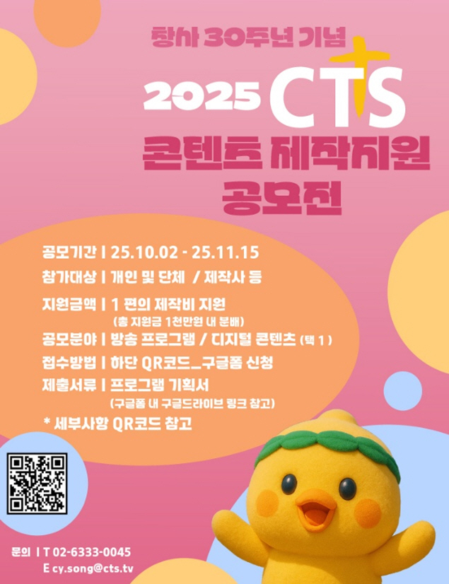 순수복음방송 CTS기독교TV(이하 CTS)가 창사 30주년을 맞아 ‘2025 CTS 콘텐츠 제작지원 공모전’을 개최한다. 이번 공모전은 기독교 세계관을 바탕으로 한 창의적인 콘텐츠를 발굴하고, 역량 있는 제작자들과 협업해 건강한 기독 콘텐츠 생태계를 조성하기 위한 취지로 마련됐다.