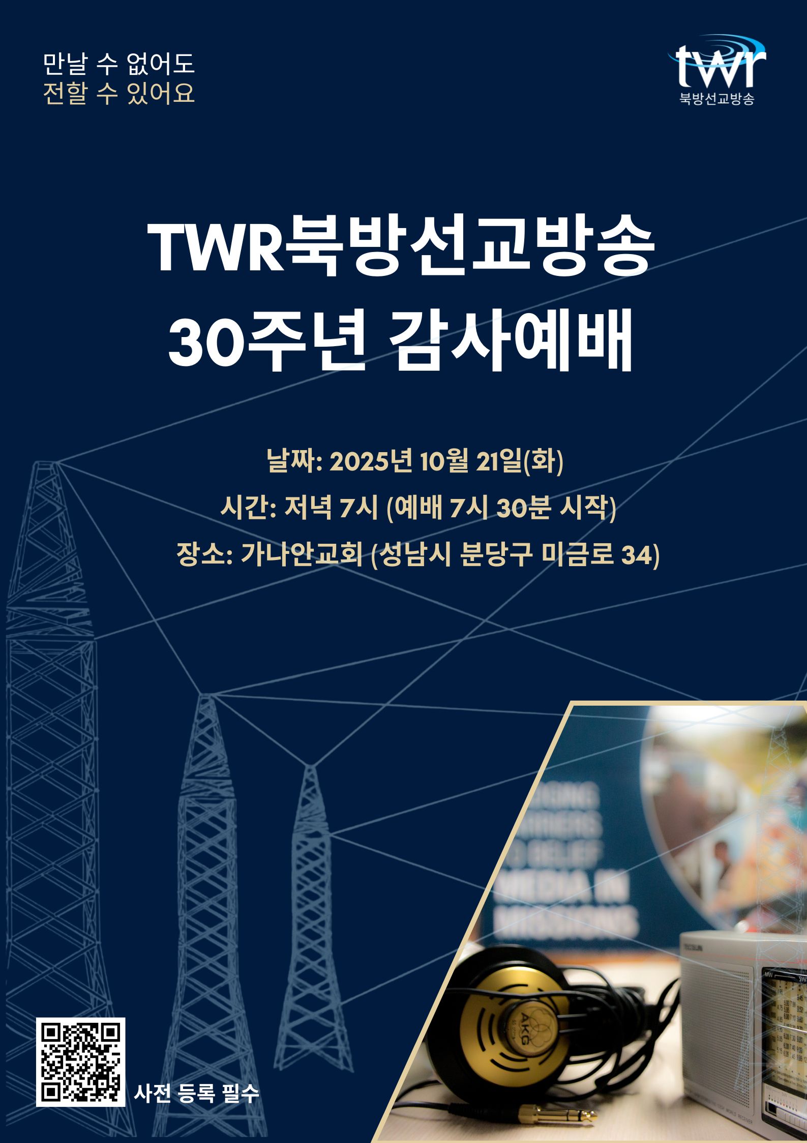 TWR Korea(북방선교방송)는 창립 30주년을 맞아 10월 21일 오후 7시 30분 분당 가나안교회(담임 장경덕 목사)에서 감사예배를 드린다. 이번 예배는 ‘만날 수 없어도 전할 수 있어요’를 주제로, 지난 30년간 북한과 북방 동포들을 향한 복음 사역을 돌아보고 앞으로의 비전과 방향을 나누는 자리로 마련됐다.
