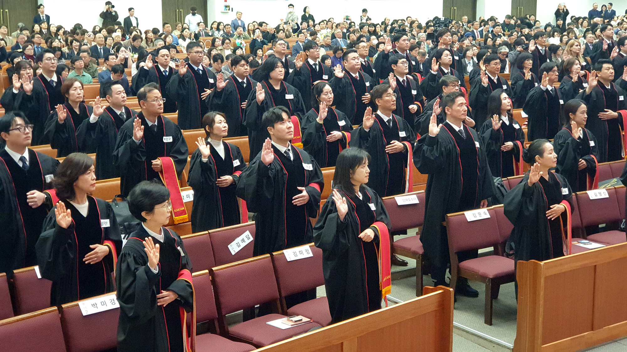 이어 이날 안수를 받는 이들에 대한 소개와 안수자들의 서약이 있은 뒤 안수례가 진행됐다. 목사 후보생들은 총 10개 조로 나눠 무대에 올라 안수를 받았다. 이후 연합회장 송용필 목사가 “성부와 성자와 성령의 이름으로” 이들이 목사가 되었음을 공포했다.