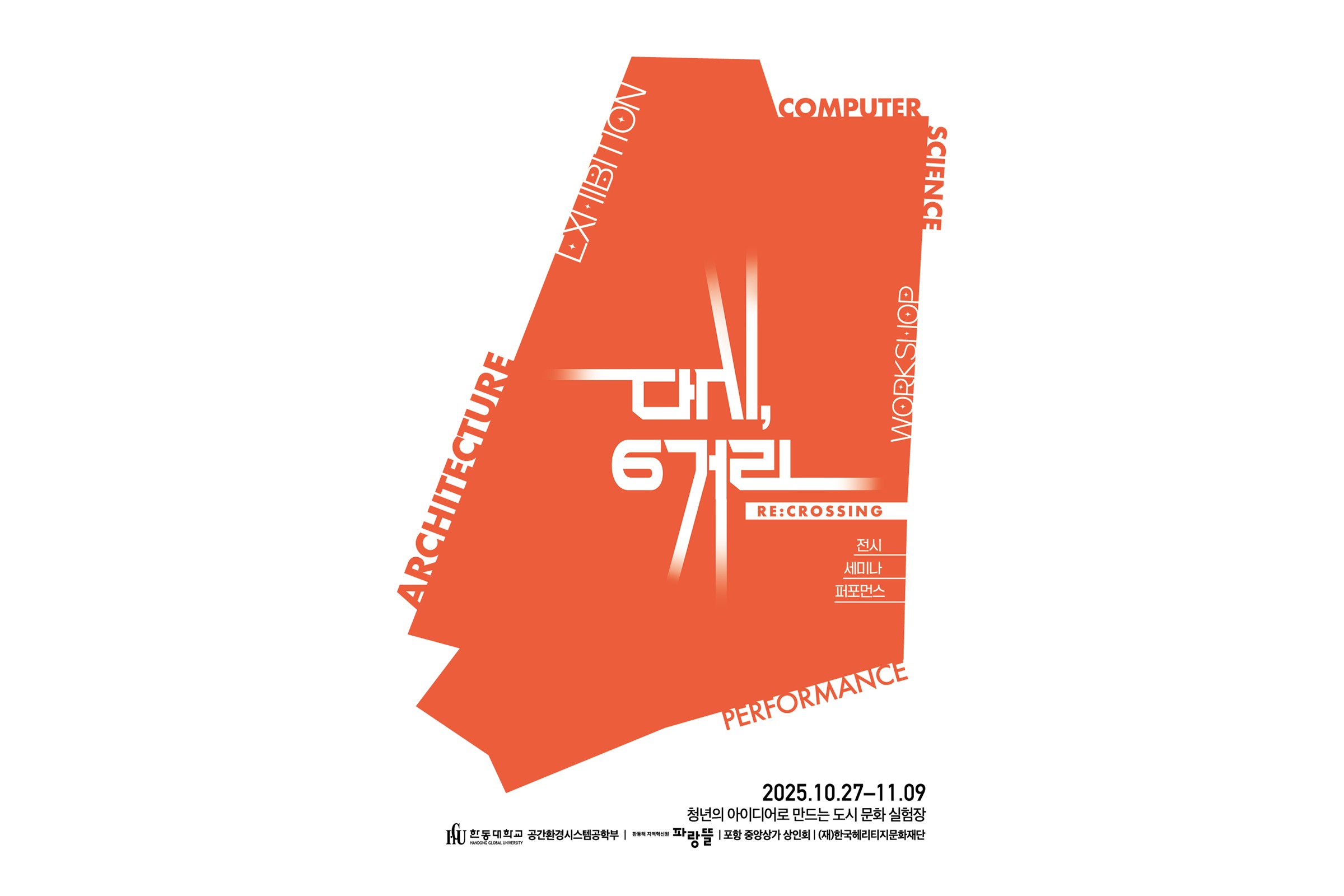 한동대는 오는 10월 27일부터 11월 9일까지 포항시 중앙상가 일대에서 청년 주도형 도시재생 프로젝트 ‘다시, 육거리 RE:CROSSING’을 개최한다고 21일 밝혔다. 개교 30주년을 맞아 기획된 이번 행사는 중앙상가의 빈 점포를 문화·예술 공간으로 재구성해 지역 중심상권에 활력을 불어넣는 것을 목표로 한다.