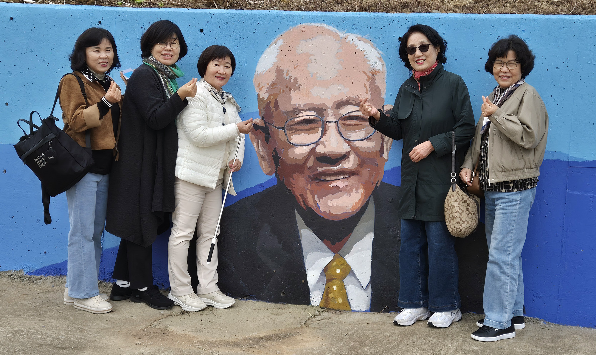 평택순복음교회 강헌식 목사와 권사들이 故 김준곤 목사 벽화 앞에서 기념촬영을 하고 있다. ©세계성시화운동본부