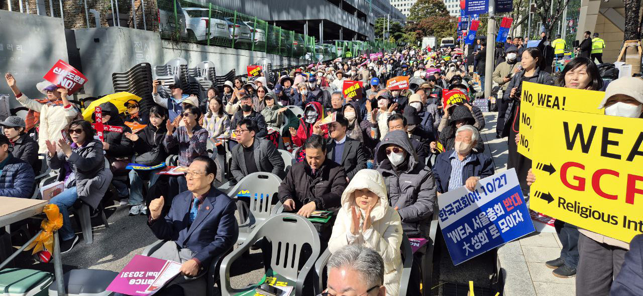 세계복음주의연맹(WEA) 서울총회가 27일 개회한 가운데, 이날 총회 장소 인근에선 이 총회에 반대하는 대규모 집회가 열렸다.