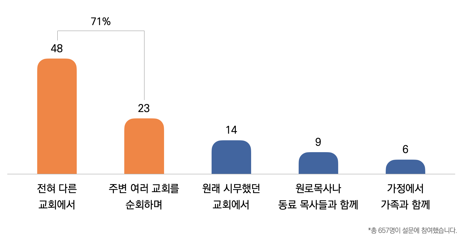 반면, ‘원래 시무했던 교회에서’를 선택한 비율은 14%에 그쳤다. 이 밖에 ‘원로목사나 동료 목사들과 함께’ 예배를 드리겠다는 의견이 9%, ‘가정에서 가족과 함께’ 드리겠다가 6%로 나타났다.