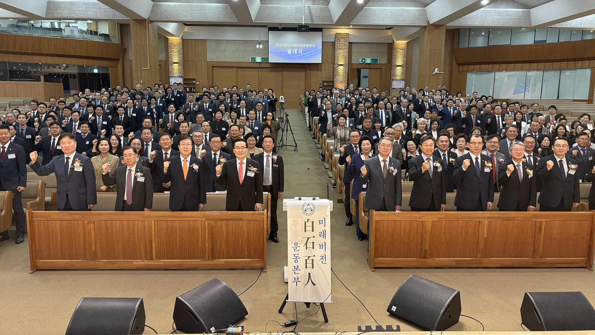 제48회기 총회장 김동기 목사의 최우선 중점사업으로 추진되는 ‘백석 100인 미래비전운동’은 미자립교회 부흥에 초점을 맞춘 운동이다. 이날 발대식에는 총회 산하 128개 노회장 및 부노회장, 서기와 총회 상비국장, 위원장 등이 참석했다.