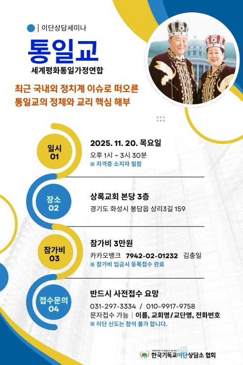 한국기독교이단상담소협회(회장 진용식 목사)가 오는 11월 20일 오후 1시 경기도 화성시 상록교회(담임 진용식 목사) 본당에서 ‘통일교 세계평화통일가정연합’ 주제로 이단상담세미나를 개최한다.