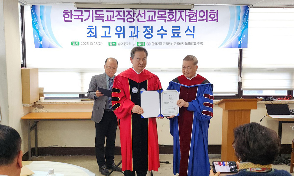 한국기독교직장선교목회자협의회(직목협, 대표회장 손윤탁 목사) 산하 직장선교목회자교육원(총장 손윤탁 목사, 학장 김윤규 목사)이 지난달 28일 남대문교회에서 ‘직장선교 최고위과정’ 첫 수료식을 개최했다. 이날 수료식에서는 교육을 성공적으로 마친 11명에게 수료증이 전달됐다.